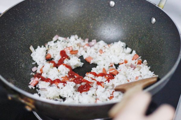 继续倒入白米饭,撒少许黑胡椒粉,挤入约1勺番茄沙司,翻炒均匀
