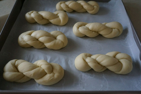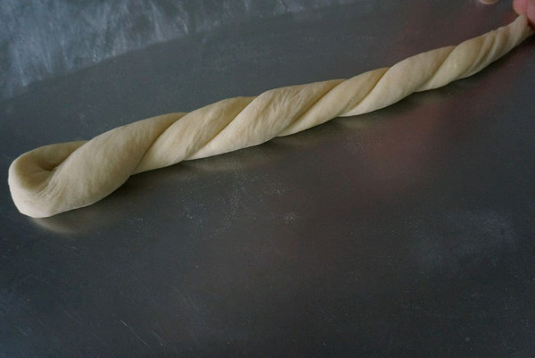 两头再次对折扭成麻花,收口捏紧,依次完成后放入垫油纸的烤盘