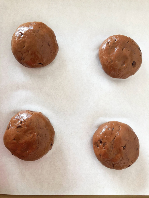 然后在面团上放上可可豆,手上和面板上都抹点油,把可可豆揉进面团里,分成4份,揉成圆团(我揉的不够圆鼓鼓,所以做出来没有那么鼓),在油纸上静置30分钟(不可忽略)