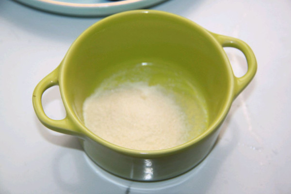 碗内加少量牛奶,融化吉利丁粉,在隔水微微加热搅拌均匀