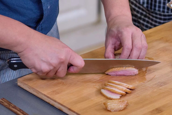 【14】切鸭肉 将烤好的鸭胸肉取出切片。