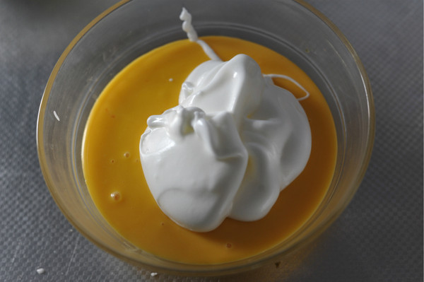 将搅拌好的面糊倒入蛋白中,搅拌均匀;