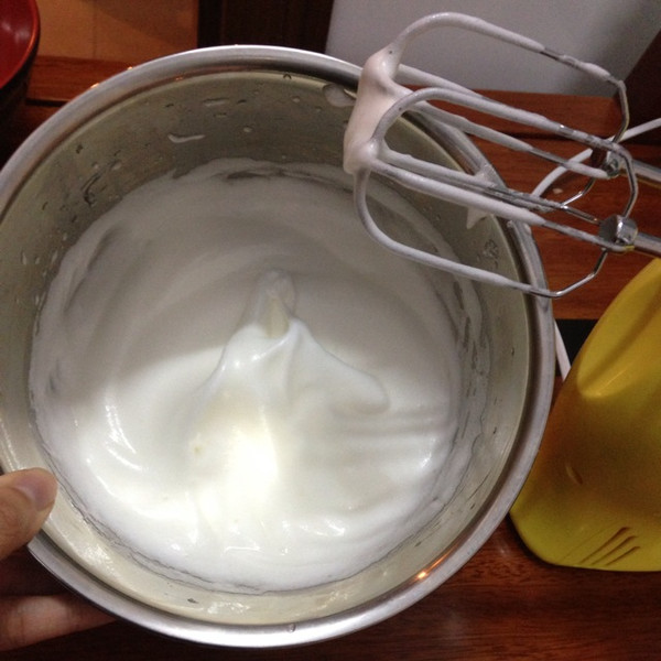 打发蛋白,其中砂糖分三次放入,打发成湿性状态。将三分之一的蛋白放到蛋黄糊中搅匀然后将蛋黄糊全部放入剩下的蛋白中,搅匀!
