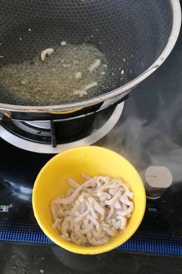 接着将盐和淀粉倒入肉丝中抓匀备用。