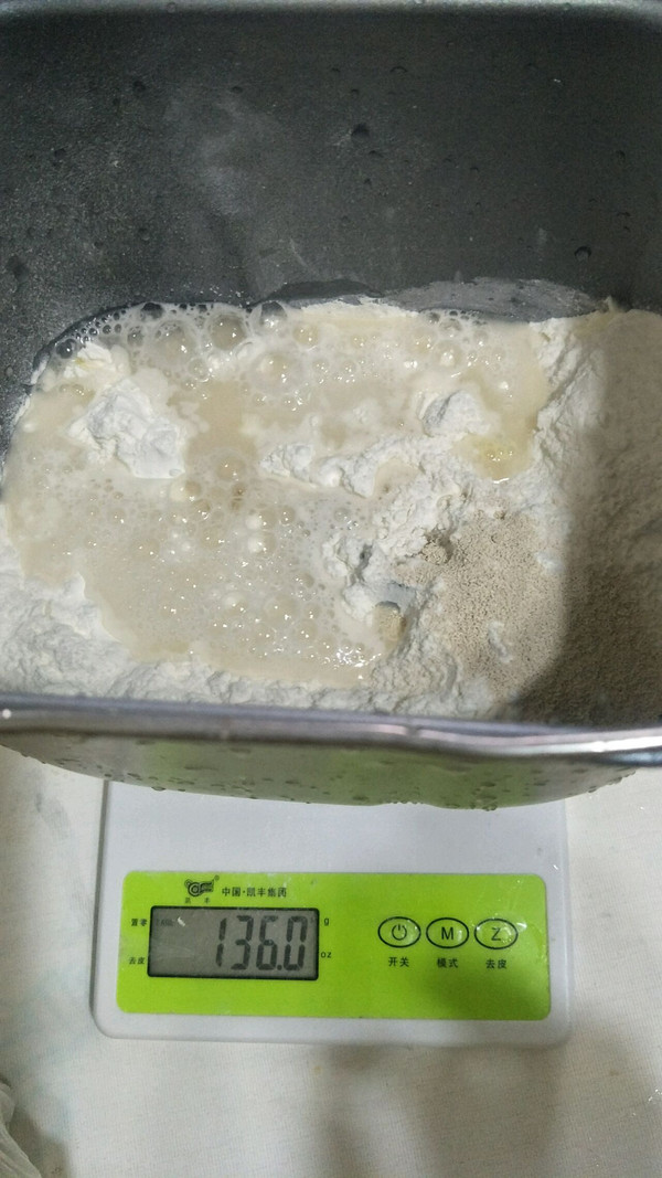 面包桶放电子称放进面粉、盐、沙糖、酵母和牛奶。