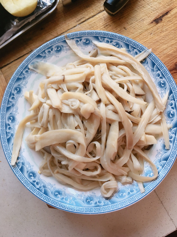 蒸好的杏鲍菇、待凉后手撕成条、捏干多余的水分