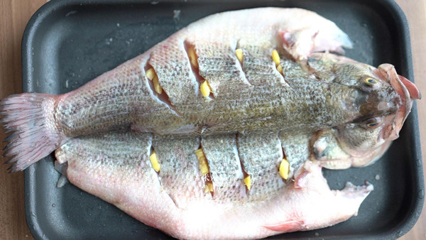 热心摊主处理好的鲈鱼一条,从肚子里沿着脊骨把背肉也切开一部分以便能平铺起来,正反两面抹上盐、料酒、老姜,腌20分钟