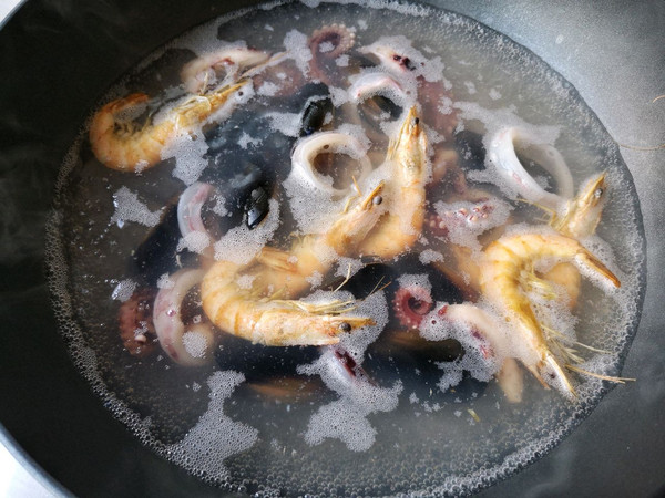 海鲜可以随意搭配,但虾一定要有,如果没有贻贝用蛤蜊也可以哒。