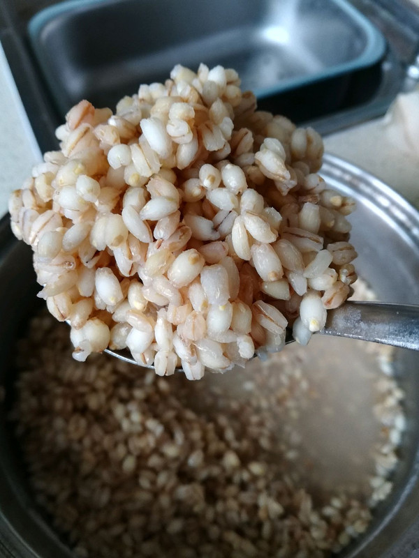 将煮好的麦仁控干水分,装入另一个器皿中。