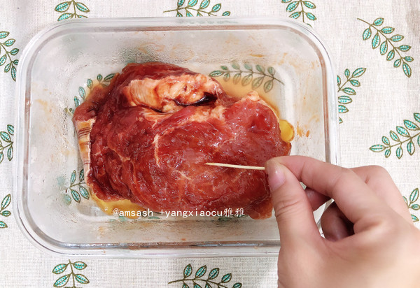 梅菜肉洗干净用厨房纸巾吸干水分,先用牙签在梅花肉上戳上小孔,以便肉更好的入味