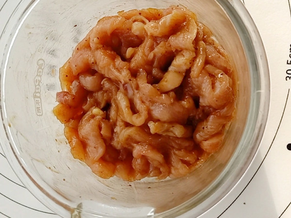 鸡胸肉加适量黑胡椒酱拌匀。