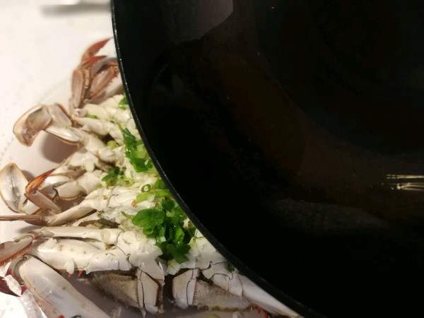 蒜蓉和葱花均匀的放在螃蟹上面用冒烟的热油泼上去,