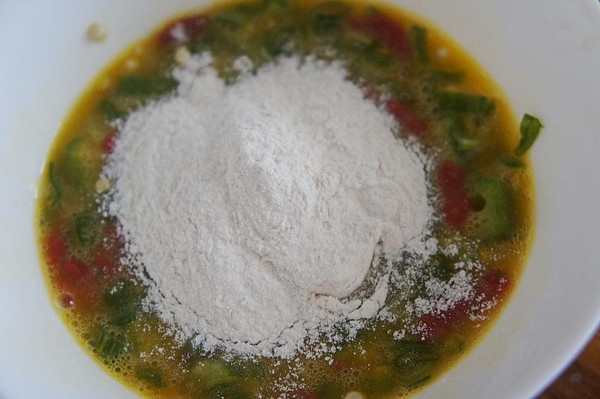 取大一点的碗或盆,加入蛋液、葱碎、秋葵片、盐搅拌均匀后,再加入面粉