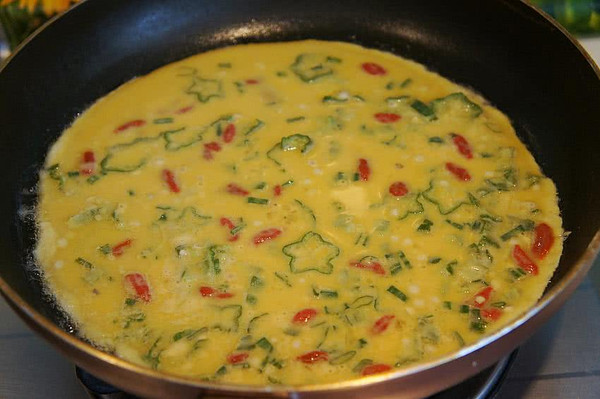 鸡蛋打散,枸杞子洗净,香葱去皮洗净切碎;解冻的秋葵洗净切片