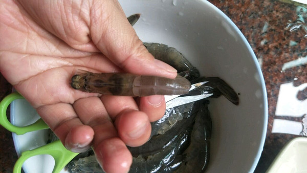 市场挑选新鲜大虾。冲洗干净,沥干水份。