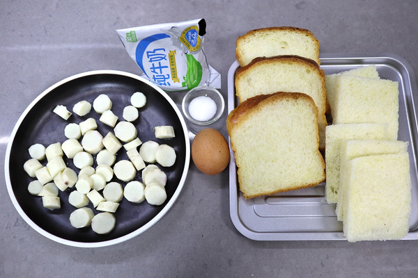 蒸好的山药段、鲜牛奶、细砂糖、鸡蛋、自制吐司准备好;吐司片用外买的也可以;