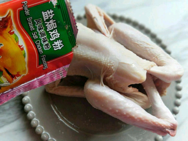 准备好盐焗粉,撒上三黄鸡身上。