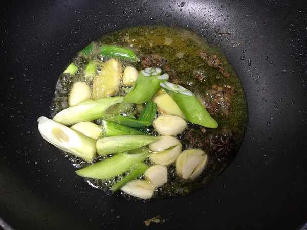 煎完鱼锅中留底油,放入葱姜蒜花椒大料大火煸香