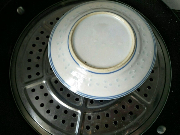 碗上盖上碟子防止水汽倒流到碗中。再盖好锅盖大火蒸二十五分钟。
