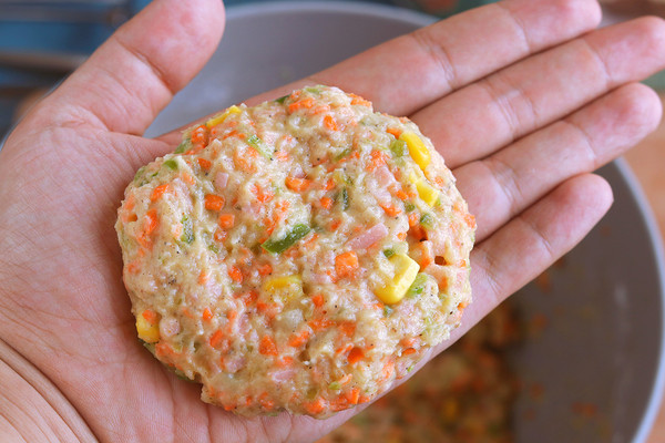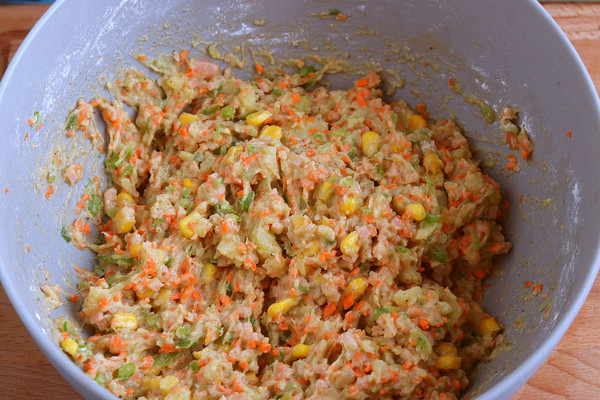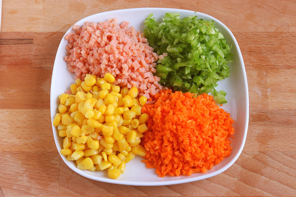 加入胡萝卜,火腿,青椒,玉米粒,搅拌均匀