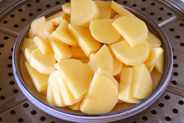 把蒸好的土豆放入沙拉碗中,用叉子或者勺子捣成泥