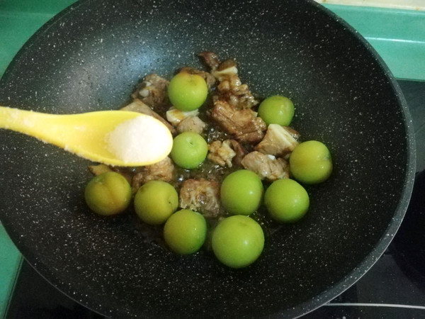接着放入少许盐和李子,翻炒一下