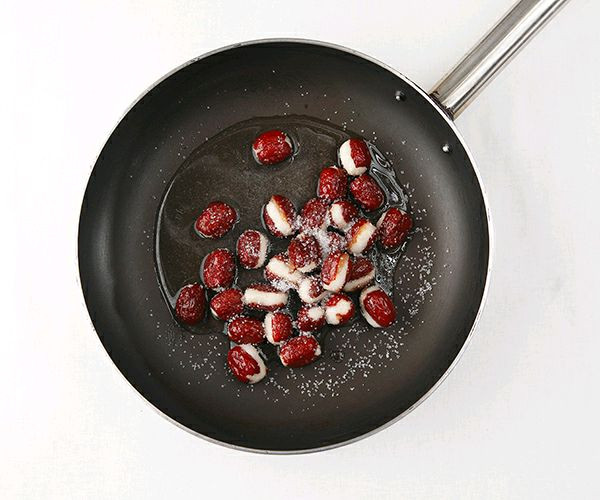 取锅放入油,大火将枣子迅速过油10秒左右,捞出备用。