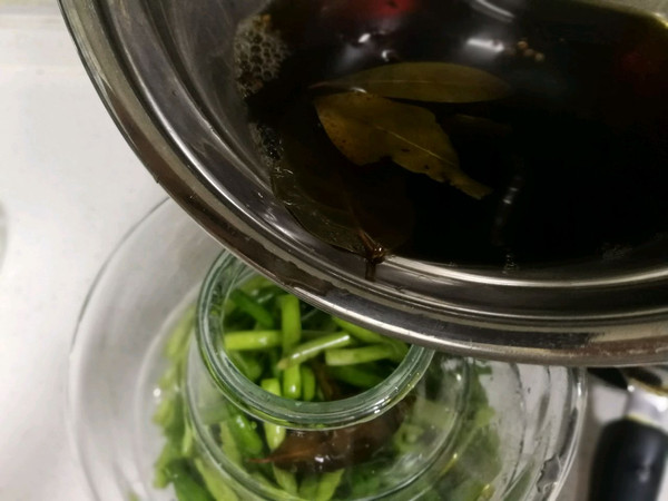 盐渍完的蒜苔放入洗净没有水分和油的容器中,倒入熬至的大料水,再倒入适量生抽和醋盖上盖子密封保存即可,盐至几个小时后就可以食用,可以多做些吃粥的时候当小咸菜。可以放几个月都不会坏。