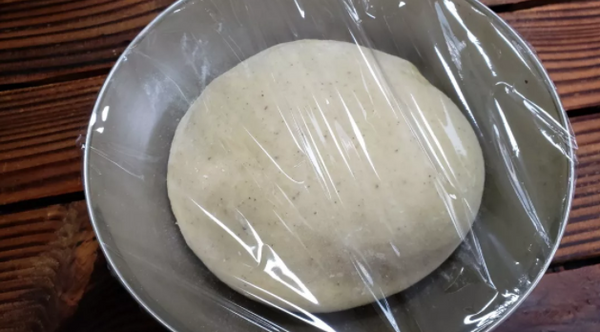 把揉好的面团放在容器中,上面覆盖保鲜膜,进行基础发酵