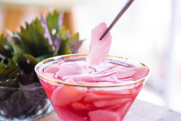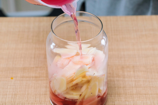 切好的仔姜整齐地铺在提前消毒好的密封罐中,倒入冷却好的紫苏水。