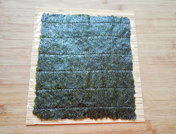 寿司帘上面铺上一张保鲜膜,放上一片寿司紫菜。