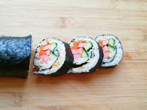 依次摆上黄瓜、火腿肠和胡萝卜条。