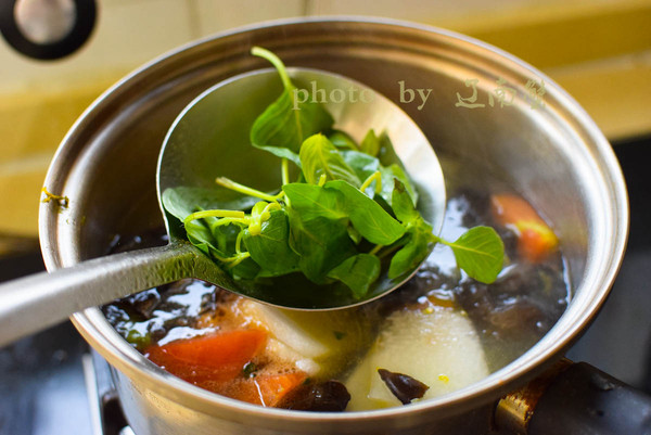 用芝麻油、盐、胡椒粉调味,关火放上荆芥叶,一道鲜美的汤就煮好了。