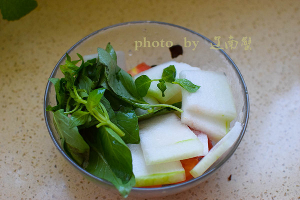 炖鱼的时候准备下汤的材料,西红柿切片,荆芥清洗干净,黑木耳提前泡好。黑木耳不是必须的,我是刚好有,就放了,如果特别喜欢加入汤中,提前泡发就好了。