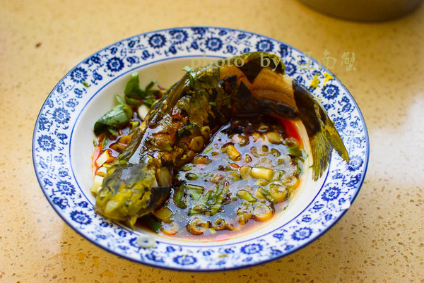 将切好的葱碎放在鱼上,用生抽、醋、辣椒油 和盐调味,顺手再舀小半勺鱼汤浇上,好吃的凉拌鱼就做好了。