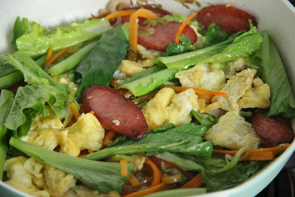 加入半勺醋,1勺生抽,1勺油泼辣子(也可以放入1勺老干妈),炒几分钟把蔬菜炒软。