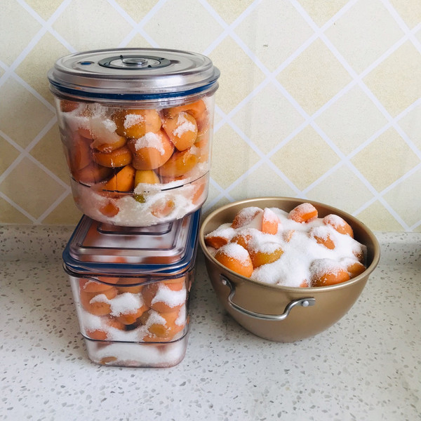 腌渍好的杏肉出了好多糖水,如图中的样子。