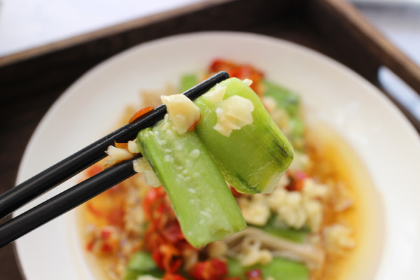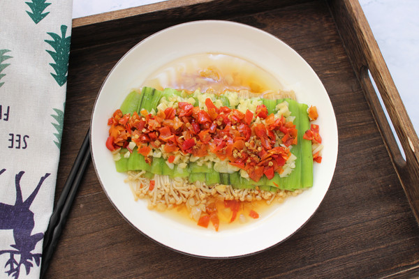 出锅倒掉蒸菜的汤水,炒锅倒入食用油烧至7成热时,淋到丝瓜金针菇上面。不需要放盐,剁椒和蒸鱼豉油都有咸味。