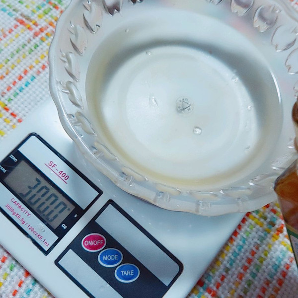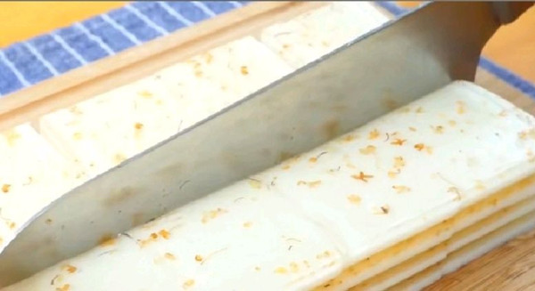 吉利丁片用凉水浸泡2分钟,沥干加入桂花浆中。