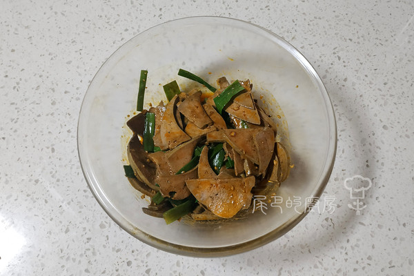 将蒜苗切寸段,在沸水中烫熟,放入肝片中,加入姜末、花椒粉、酱油、陈醋、糊辣油,拌匀即可。