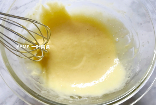 取一大勺蛋白霜放入蛋黄糊里,用蛋抽拌匀,蛋抽可以更快混合均匀,但要避免往一个方向画圈搅拌。