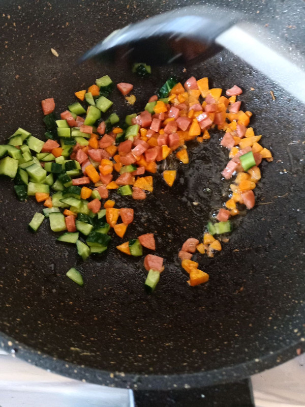 将黄瓜,胡萝卜,火腿肠切丁备用。