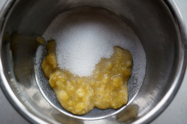 取出放入盆中,加入细砂糖,用手动打蛋器搅拌均匀;