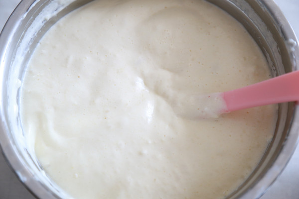 蛋液打好后,加入提前过筛好的低筋面粉,然后用橡皮刮刀从下至上翻拌的方式拌匀面糊。