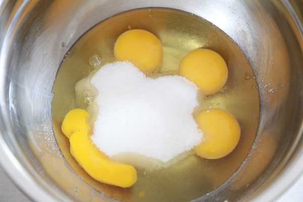 将4个鸡蛋打入打蛋盆中,鸡蛋一定要用常温的,不然不容易打发。
