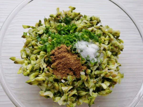 处理好的槐花里面加入葱花、五香粉和盐搅拌均匀。