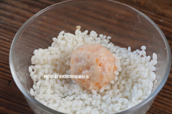 取一小勺猪肉馅放手心,用两个手掌尽量搓圆。做好的丸子再在糯米上滚一圈,使整个团子沾上糯米。