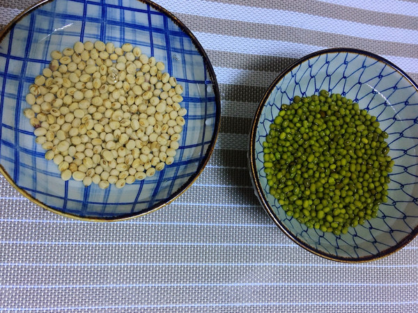 绿豆和黄豆的分别清洗干净,用清水浸泡四个小时或者放入冰箱冷藏浸泡一夜。