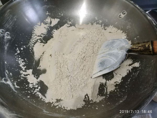 芝麻粉、杏仁粉倒入炒熟的糯米粉拌匀。如果想口感顺滑,可以将研磨出来的粉过筛。