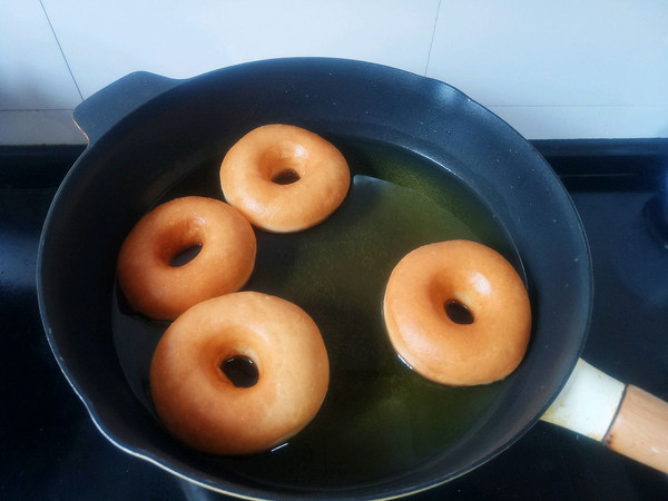 锅内倒入半锅油,大火加热到8成热后,转中火,把发酵好的甜甜圈生胚下锅,锅子小的话,可以分次炸